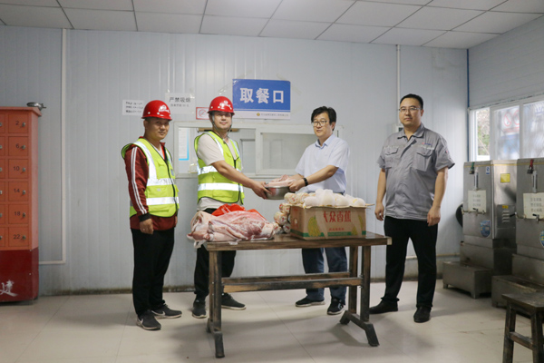之后,刘志刚带着月饼、猪肉等慰问品到作业班组生活区对一线工人进行慰问,在食堂刘志刚把猪肉递到班组长手里并嘱咐他们一定要提高节日期间的伙食水平,让坚持在现场施工的工人吃好,消除他们的后顾之忧。